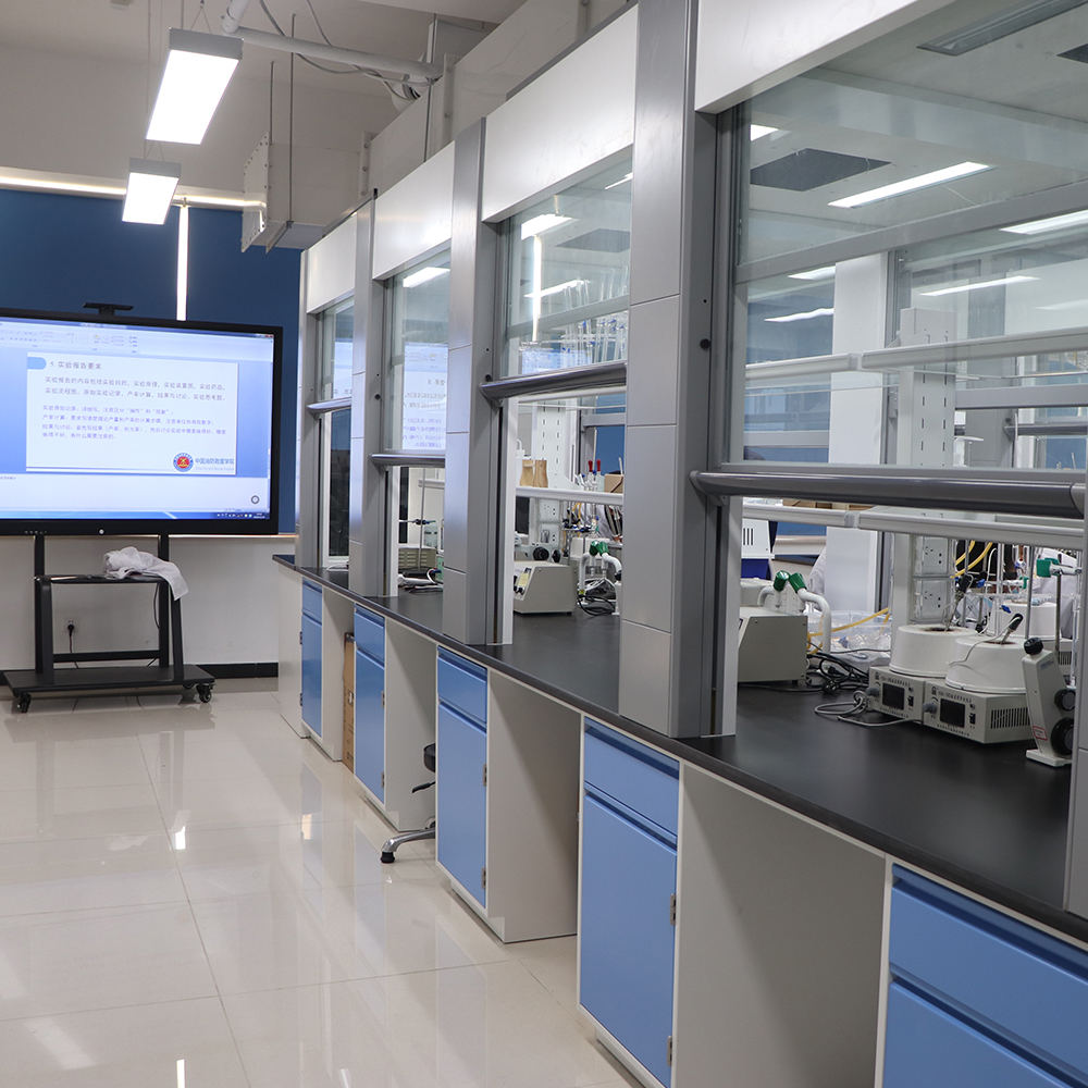 實驗室中央通常設置中央實驗臺,臺上設置試劑架,中央實驗臺的縱向側面或中間設置洗滌臺 (洗滌臺設置靠近水源)。中央實驗臺的正向和縱向一側設置試驗邊臺、試劑架、組合架、吊柜等,另一側靠墻設置通風柜 (通風柜的位置應便于通風管道的連接)、干燥架、藥品柜、器皿柜。大門的左側通常放置安全設備,洗眼器、滅火器等。試驗臺與側墻之間的凈距不應小于1.20m,與大門的凈距不應小于1.20m。