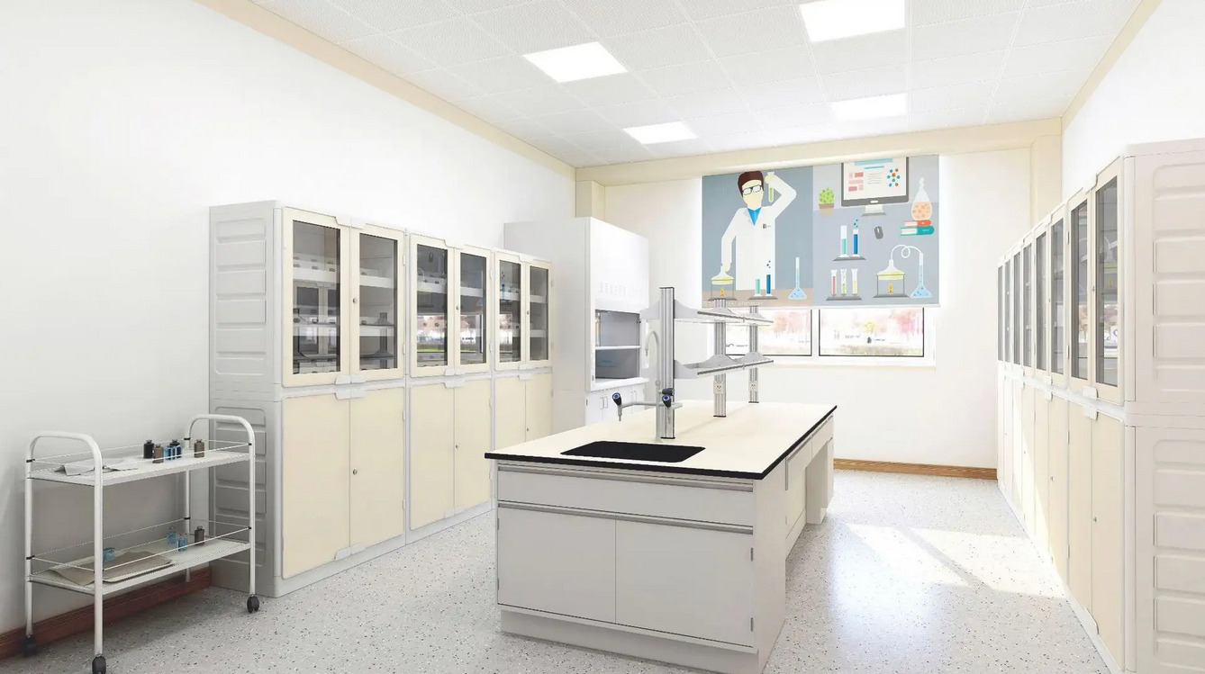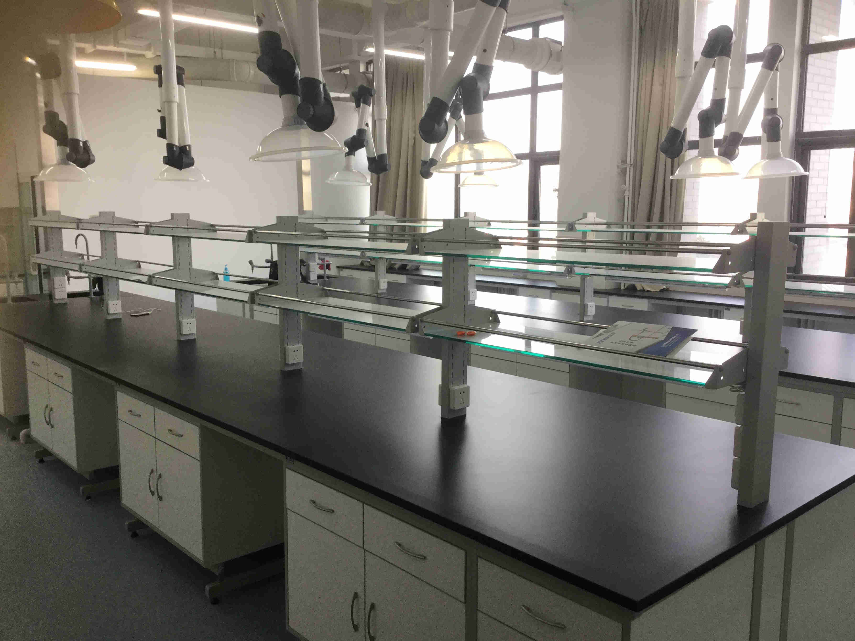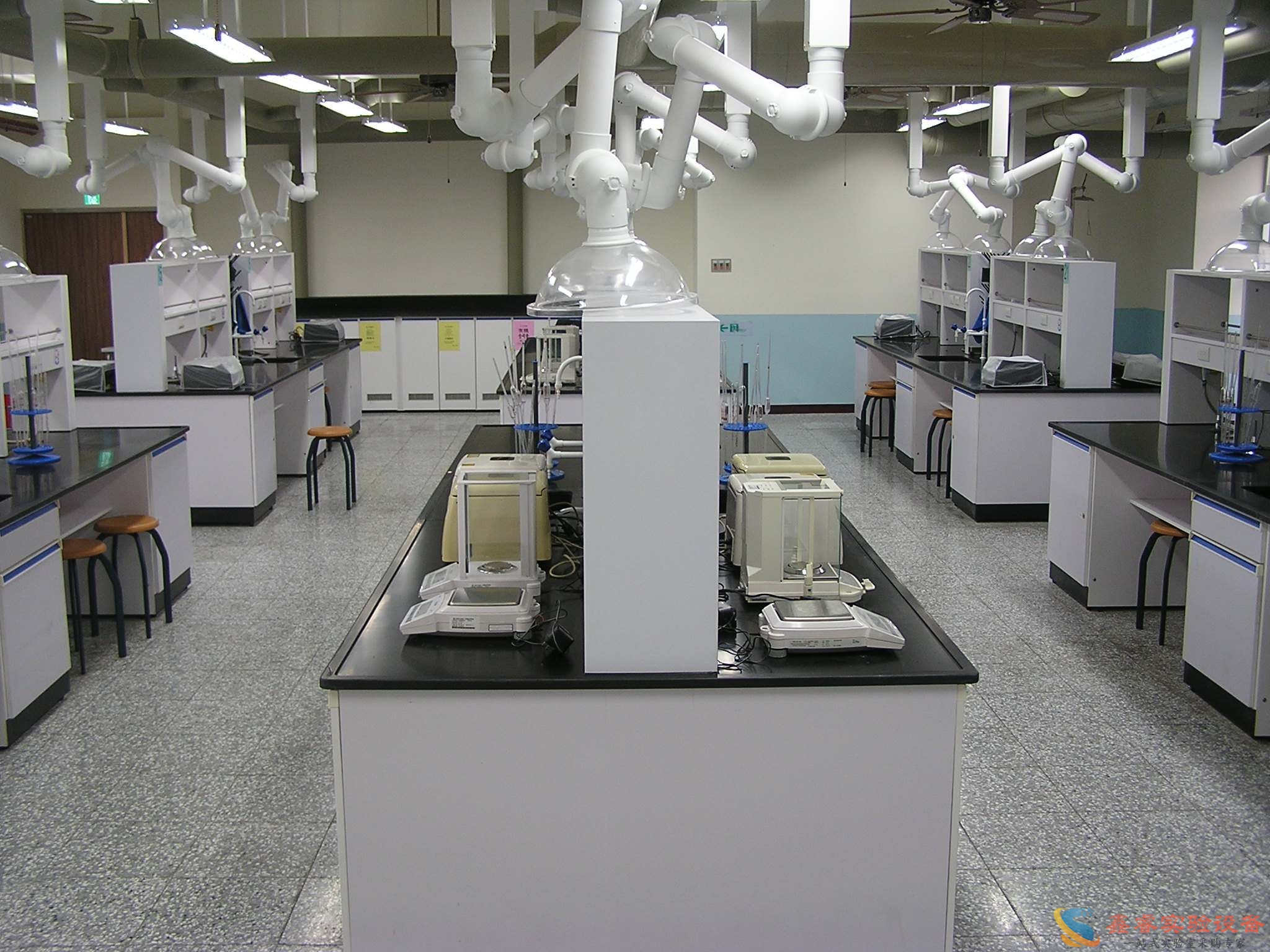 (5)試驗臺:主要由臺面、臺下的支架和器皿柜組成,為了方便操作,臺上可設置樣品架,臺的兩端可安裝水槽。臺面一般寬為750毫米或1500毫米,長度根據房間尺寸,可設置為1500-3000毫米,高度一般為800-850毫米,臺面常用貼面理化板、實心理化板、環氧樹脂板、千思板、陶瓷板等制成。理想的臺面應平整、不易碎裂、耐酸堿及溶劑腐蝕,耐熱,不易碰碎玻璃器皿等。